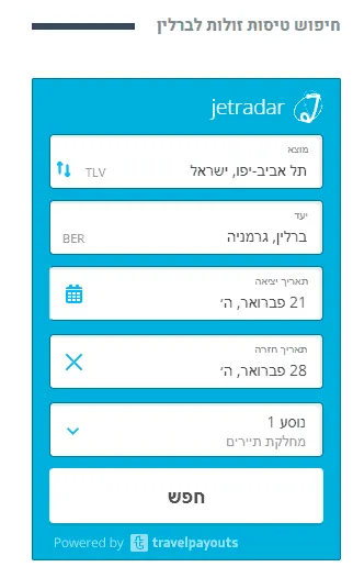 נתחיל בזה שקיצרנו לכם את הדרך לאתר השוואת טיסות ג’טראדר והוא נמצא ממש כאן בצד שמאל של המסך מנוע חיפוש המתקדם ביותר שבו תוכלו להתחיל למצוא טיסות לכל יעד שתבחרו במחירים הזולים ביותר (כמובן שאנחנו ביקשנו שהדיפולט יהיה ליעד ברלין).