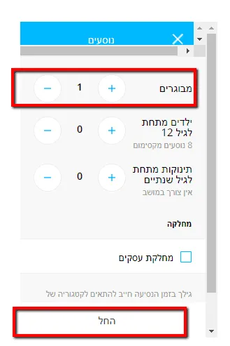 תתבקשו למלא אחרי ההוראות (שימו לב שהדיפולט כרגע זה נוסע אחד) אם אתם נוסעים זוג או משפחה פשוט תלחצו על כפתור “נוסע” ותוסיפו את מס’ הנוסעים הרצוי (כמו שמופיע בתמונה).