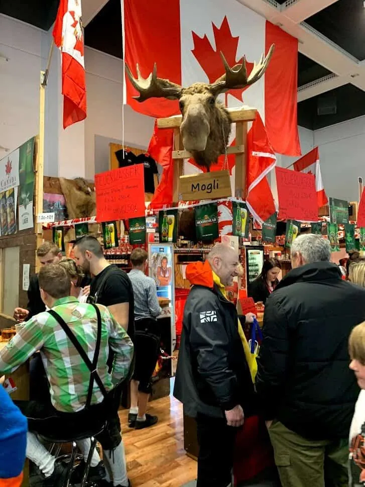 הדוכן הקנדי נבנה באווירה של פאב, עם מוזיקה ברקע.