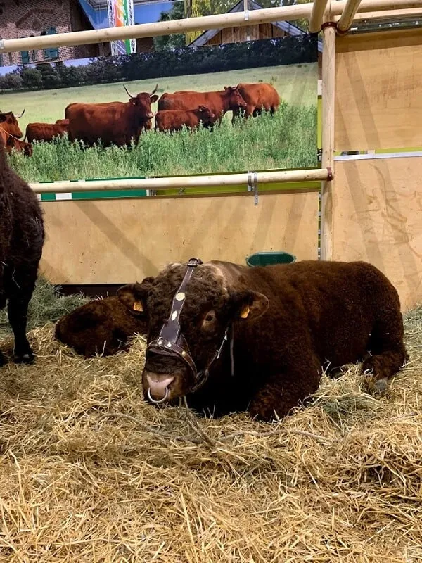 המתחם האחרון של החיות, כלל כבשים וטלאים מסוגים שונים, ומה שהכי משך את העין היא תצוגת הפרות. הפרות הגיעו מרחבי גרמניה במיוחד עבור התערוכה. מדובר בעשרות סוגי פרות שונות, בצבעים שונים ובמשקלים שונים, כאשר הפרה השמנה ביותר שוקלת יותר מ 1,000 קילו, והיה ניתן לראות אותה בתצוגה. חוץ מזה שהריח הוא כמו לבקר ברפת, תצוגת הפרות מקורית ומיוחדת.